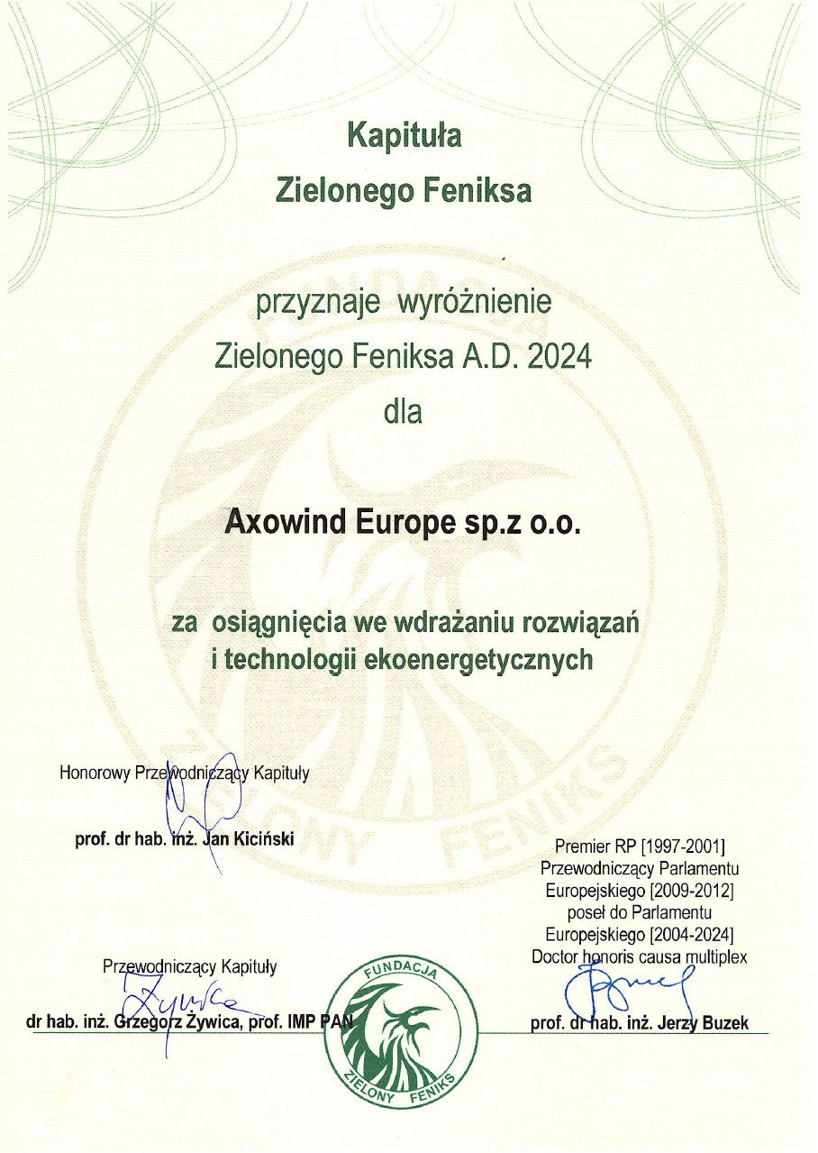 Axowind otrzymał Nagrodę BlueSky przyznaną przez Akademię Energii Odnawialnej miasta Shenzhen w Chinach za projekt 15 kW VAWT (TBD). Najlepsze na Świecie Scenariusze Inwestycyjny 2018 roku, dotyczący zastosowania Nowych Technologii na polach Ekologicznych i Niskoemisyjnych.